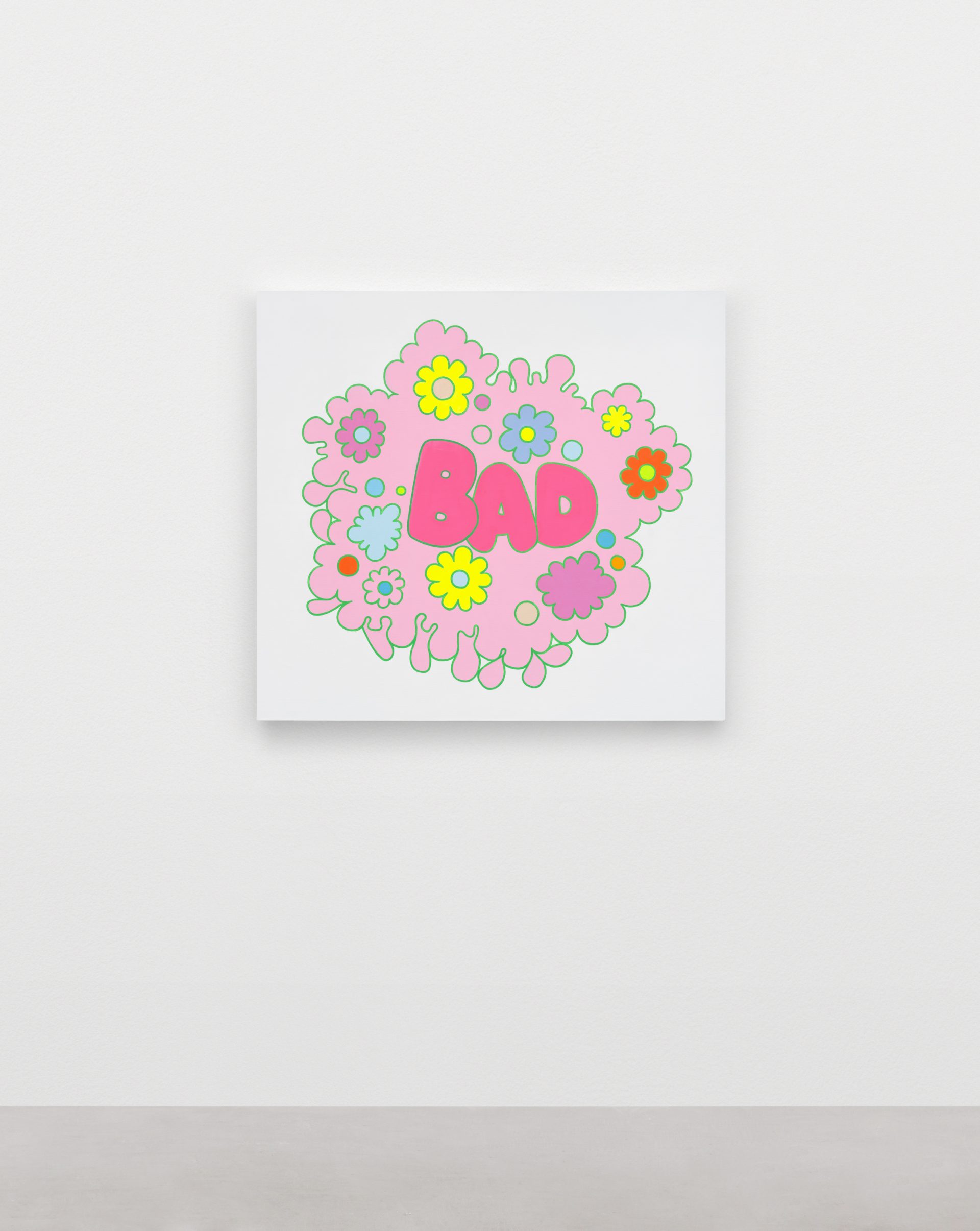 In their immediate delivery, van der Stokker’s works beckon happy-go-lucky intonations in their fanciful, ‘feminine’, curlicued and flower- powered familiarity. Their formal bubbled, blobby, and loopy approachable techniques may recall the doodlings more traditionally relegated to the notebook margins of a teenage girl, while the textual inclusions create dichotomies that illuminate more cutting messages and comment upon more condemning realities.