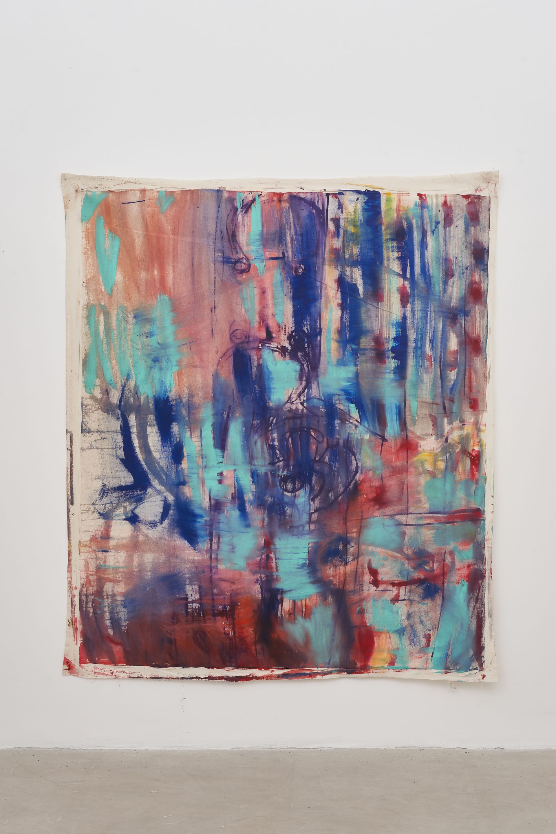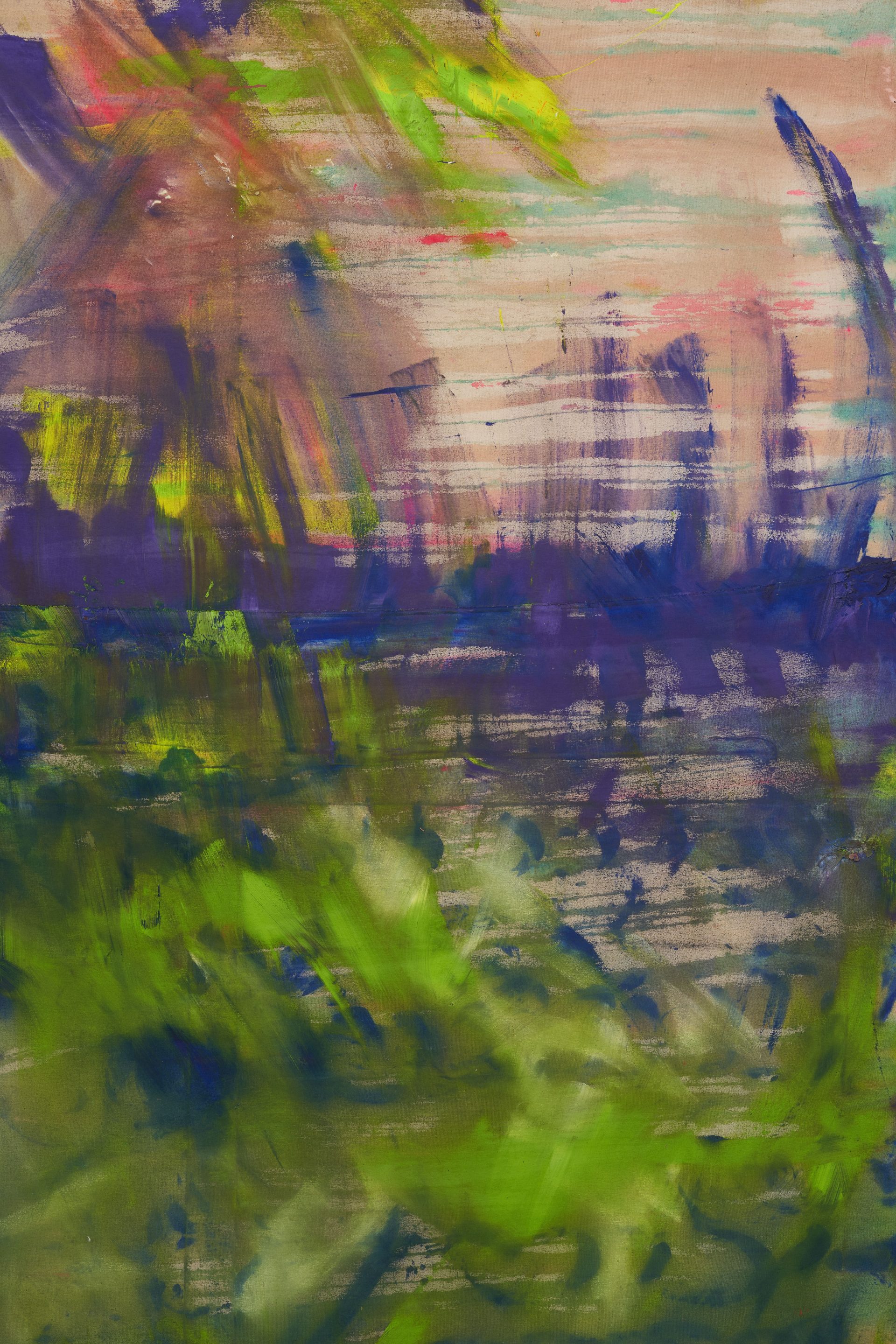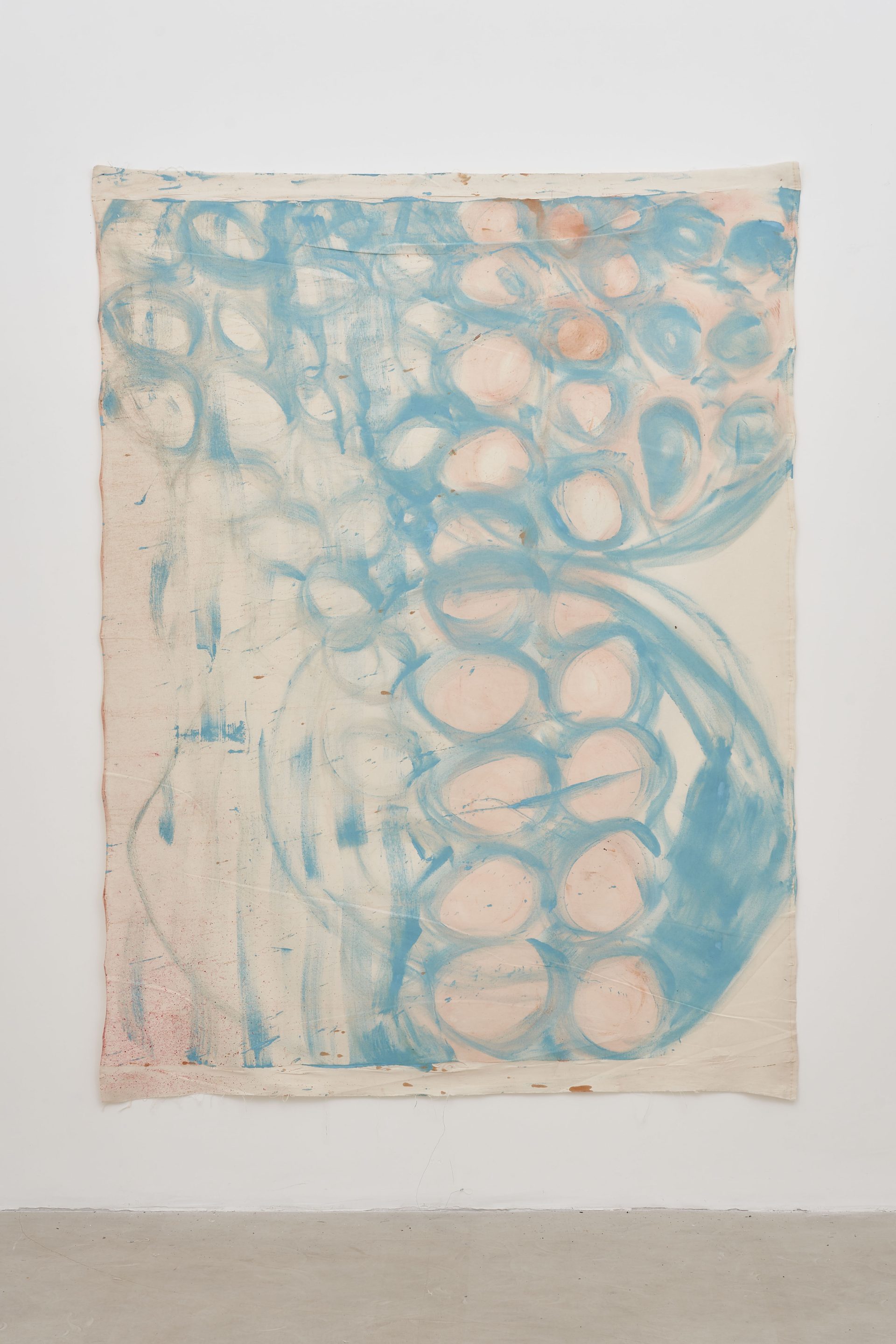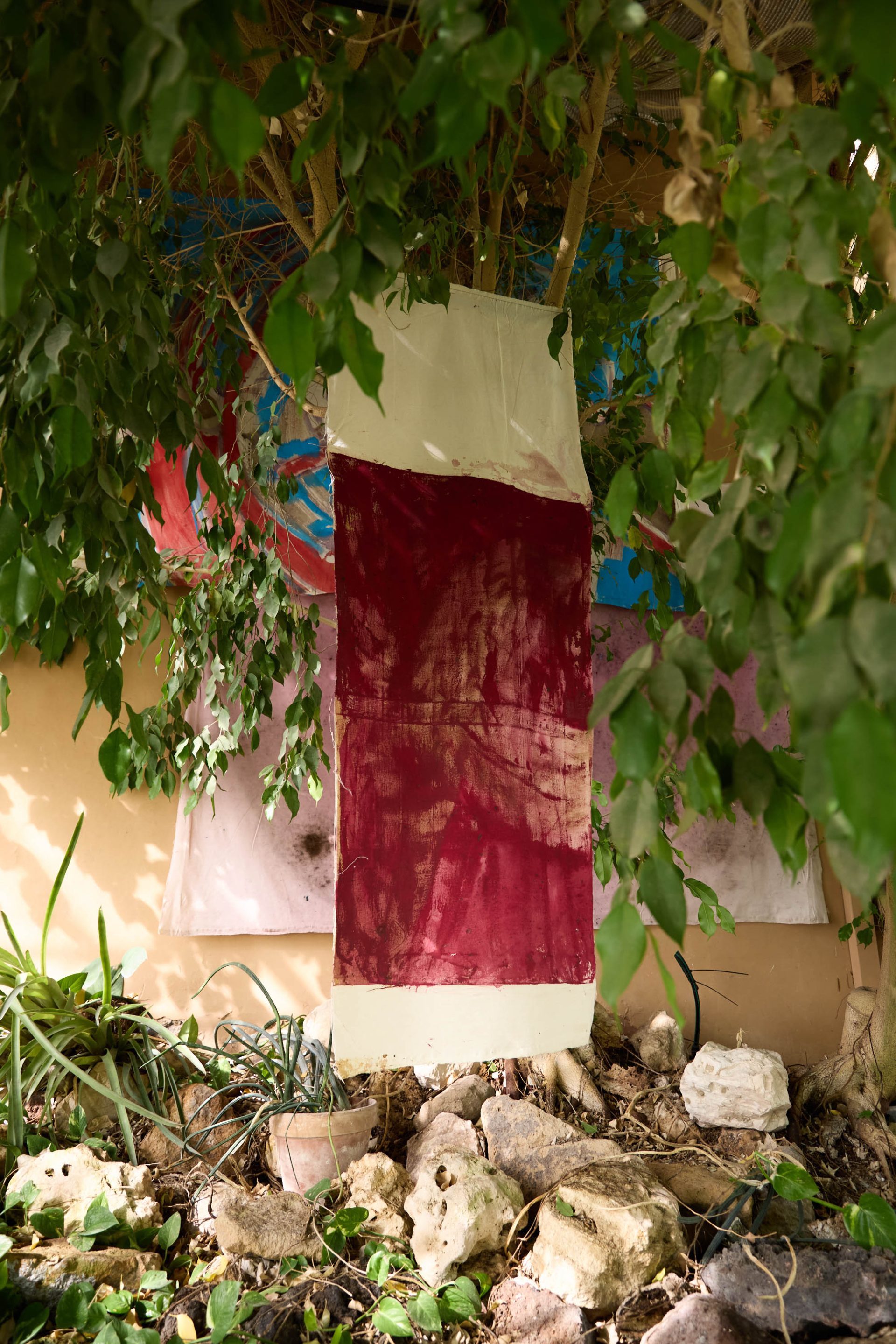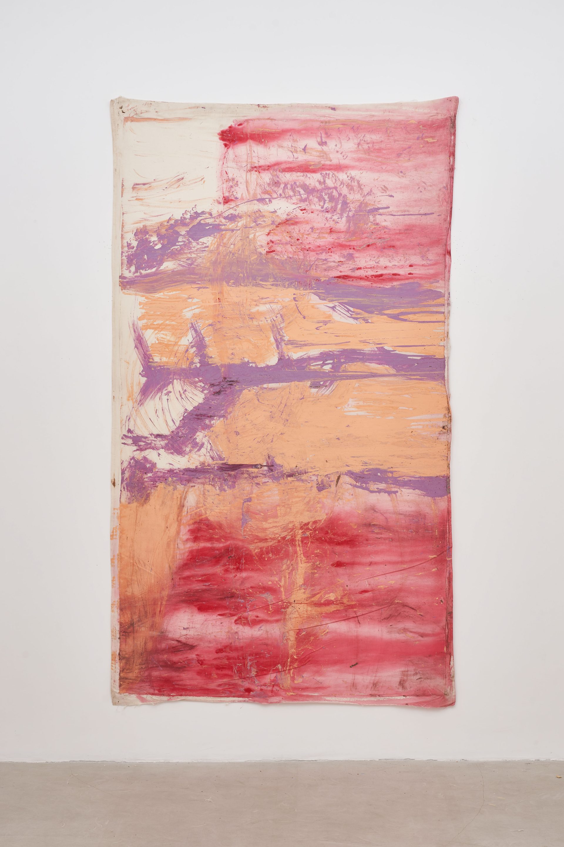 for decades, vivian suter has developed a deeply immersive painting practice shaped by her immediate surroundings. her work operates as a form of mapping and recording the environment in which it is produced. the tropical rainforest actively participates in the making of her paintings: canvases are exposed to rain, mud, wind, and organic matter, accumulating stains, imprints, and traces of daily life. branches leave scratches, and even the footprints of her dogs—tintin, nina, and disco—become part of the surface. her practice dissolves the boundary between studio and landscape, allowing nature to act as both collaborator and author.
