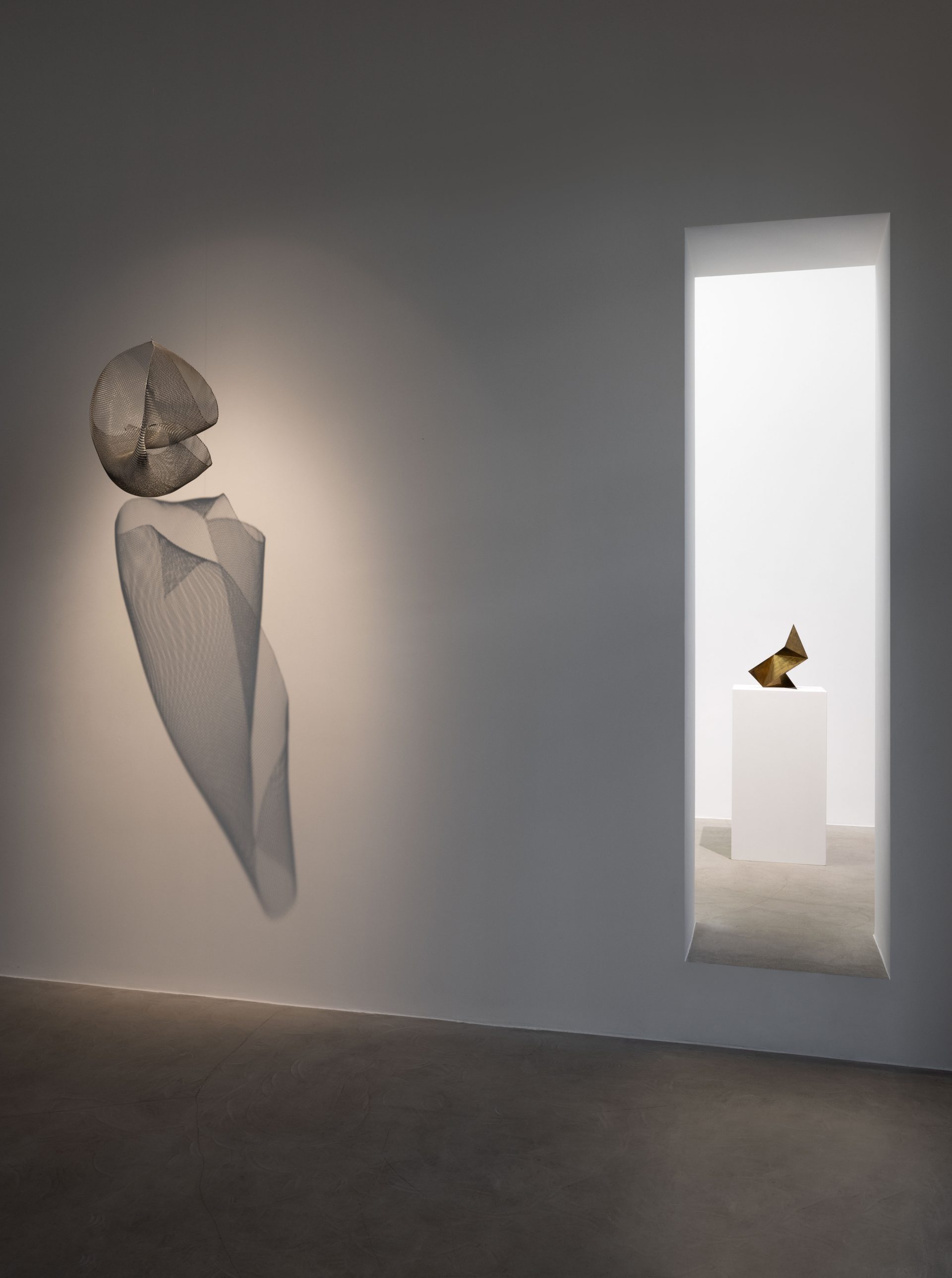 Taking on board both the theorizations of the Futurists and the research of László Moholy-Nagy and others, Munari developed the idea of self-propelled mobiles, and in the early 1930s started to explore, with his Useless Machines, the concept of abstractionism in space. He utilized his “machines,” designed with minimal forms and a limited use of color, as devices able to produce abstract shapes on the walls of the environment through the play of light and shadow, obtaining in this way short movies without the use of film. These experiments culminated in the creation of environments based on topological and “planar” sculptures, like Concave-Convex of 1947, made from a sheet of wire mesh folded inwards at preestablished points that when suitably illuminated produced evanescent images in the space in which the viewer stood.