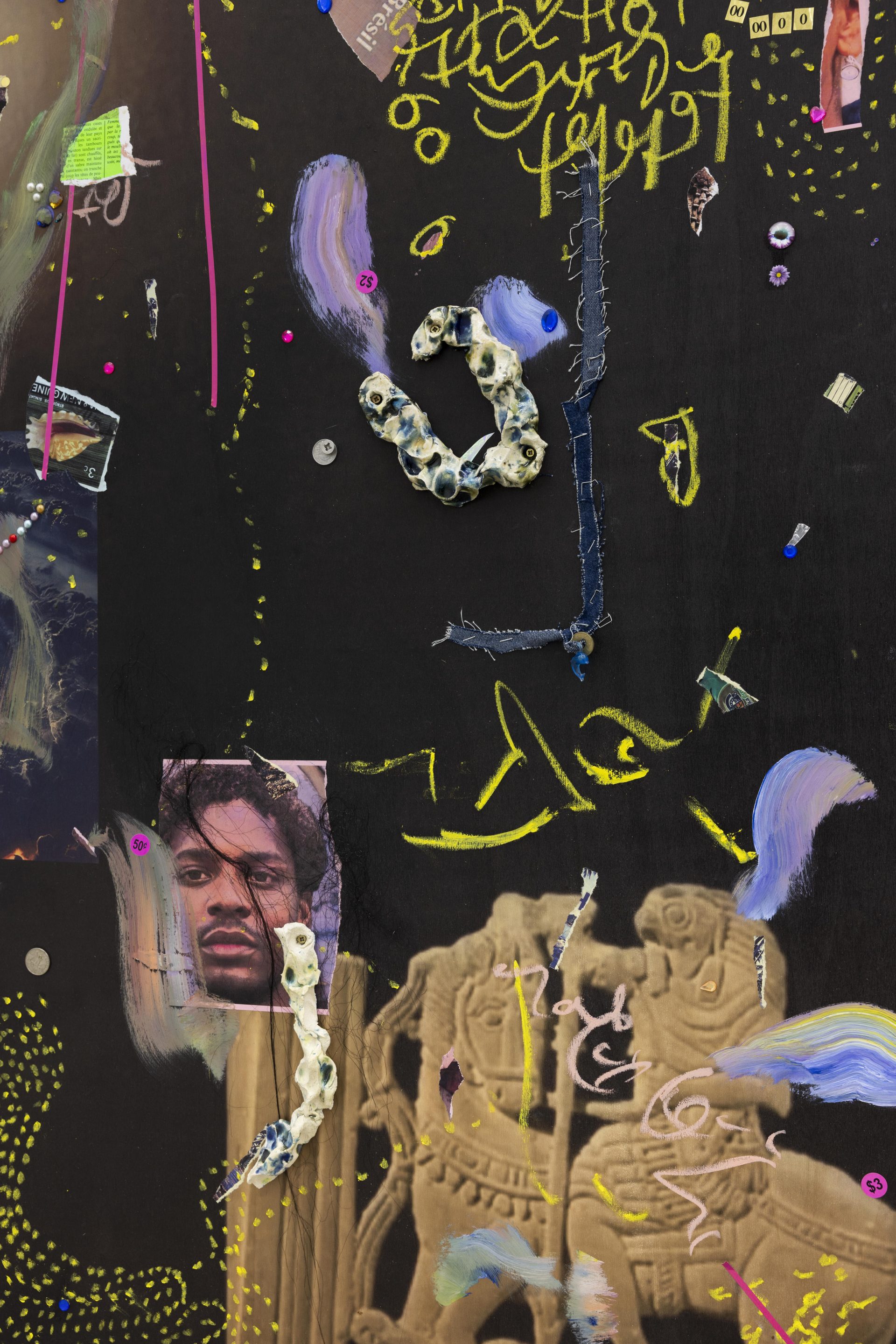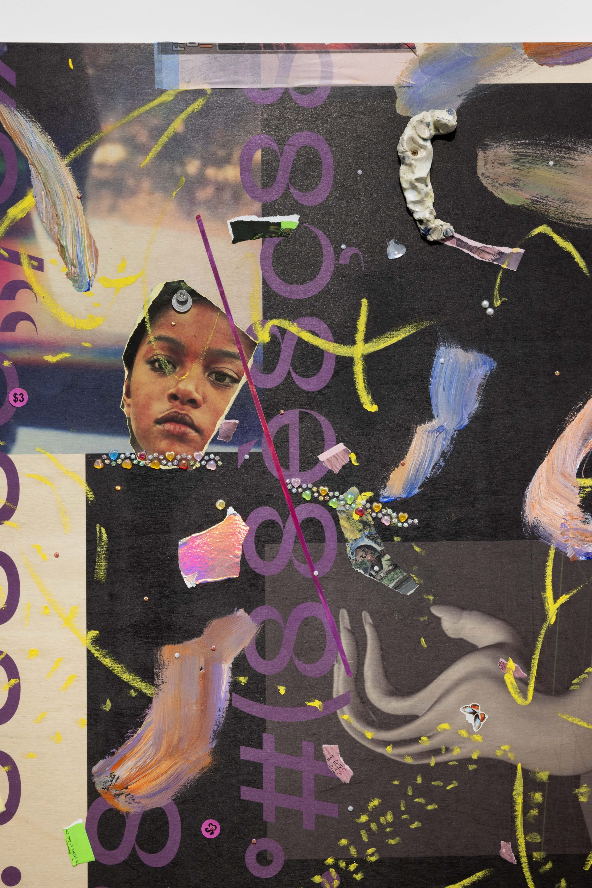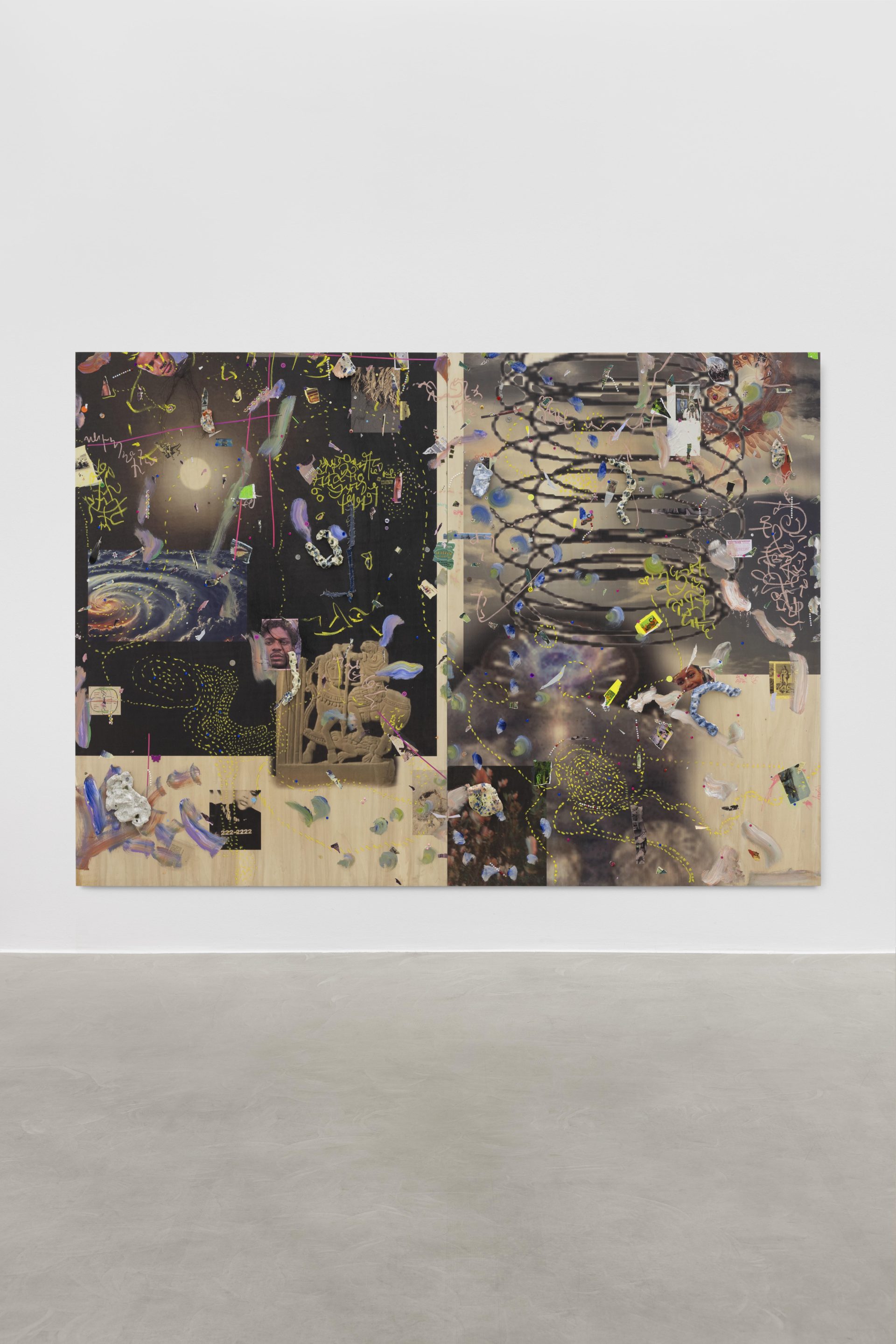 Across both Milan and New York, new works from Safe Space for a Passing History develop the artist’s collaged “scrap‑paintings,” where photographs, talismans, and textual fragments are layered onto reclaimed wooden panels, repurposed from the shipping crates of her earlier installations. These surfaces operate like moodboards for thought,sites where disparate histories and memories converge. Rather than illustrating a single narrative, they hold multiple temporalities at once – anticolonial and abolitionist histories, Indigenous guardianship of knowledge, and popular culture as a communal balm – mapping networks of resilience and transformation. Profoundly influenced by the work of British author and critic Ekow Eshun and Pan- Africanist Nioussérê Kalala Omotunde, Gaëlle Choisne is also driven by a desire for reparation: “I connect with an energy, I channel messages from other worlds to create new temporal lines of healing and make our planet healthier.”