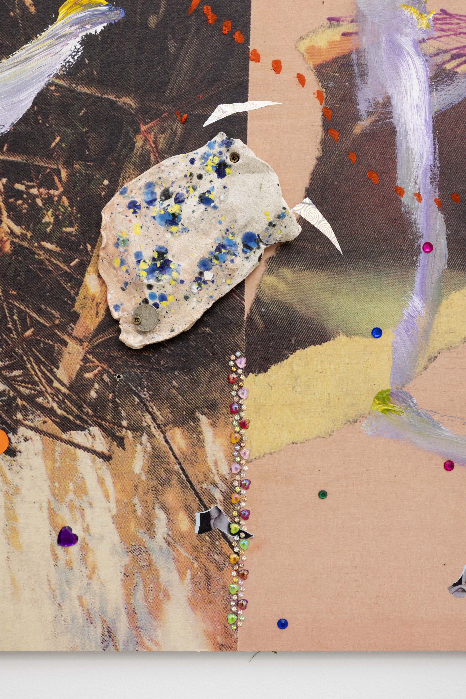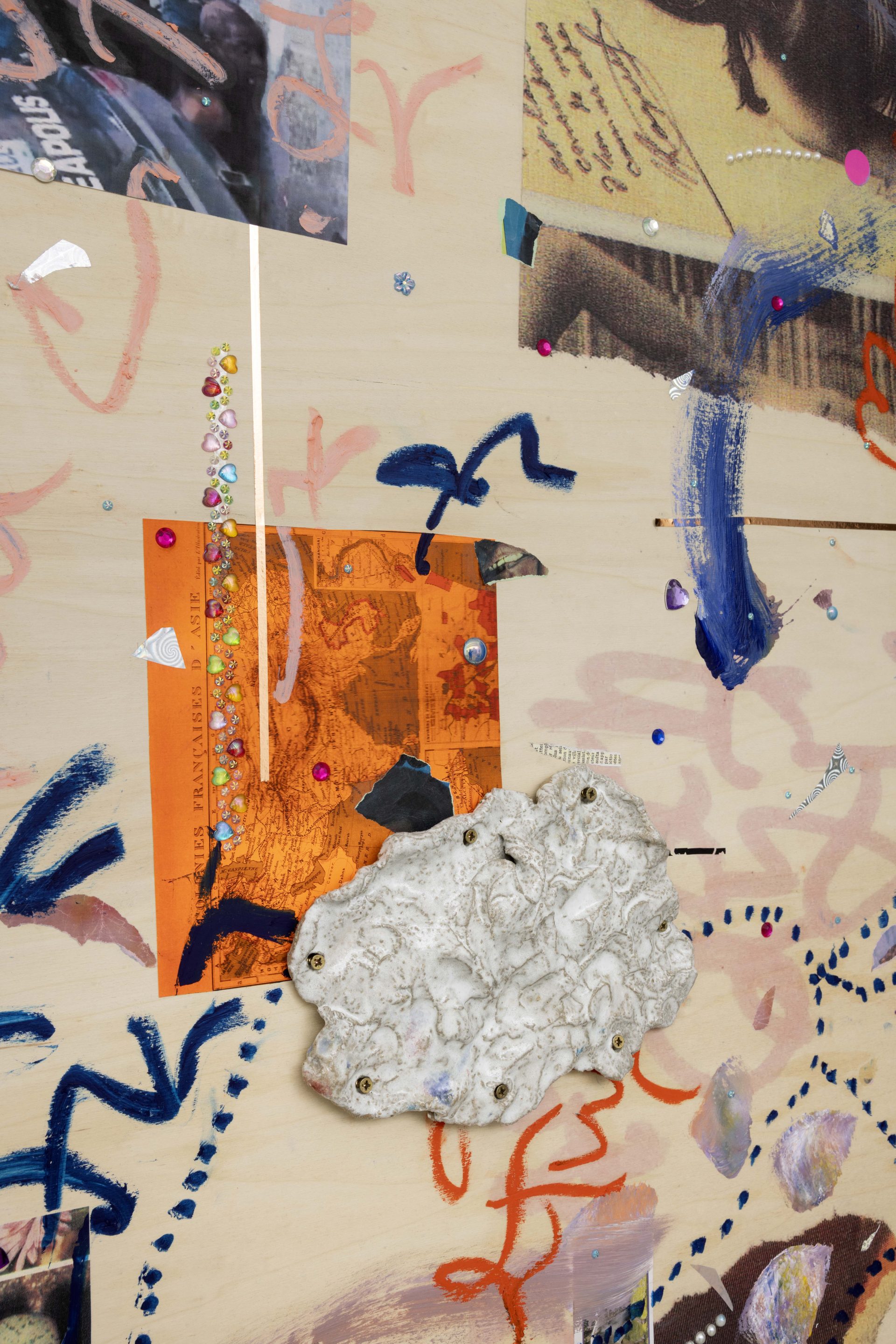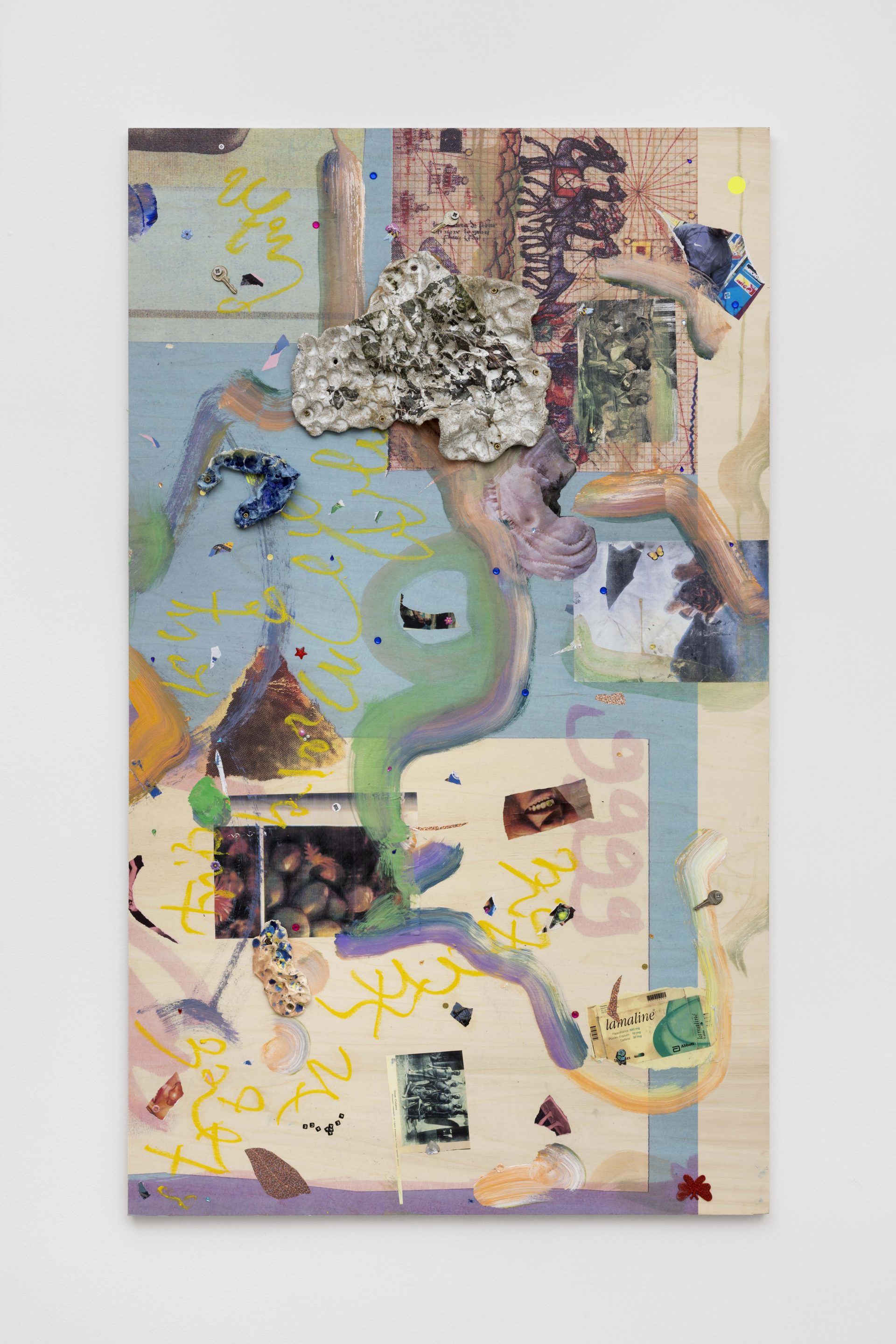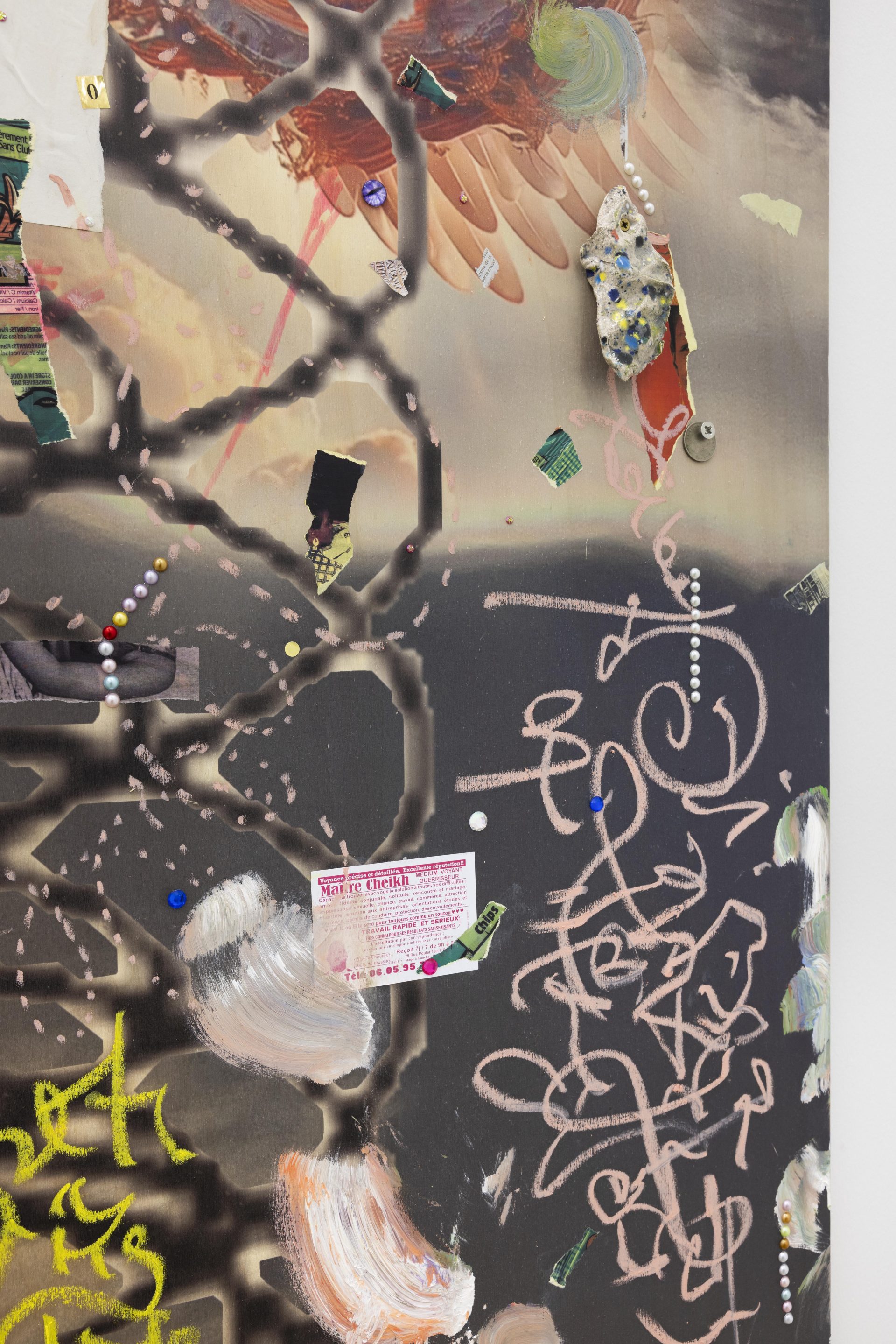 Across both Milan and New York, new works from Safe Space for a Passing History develop the artist’s collaged “scrap‑paintings,” where photographs, talismans, and textual fragments are layered onto reclaimed wooden panels, repurposed from the shipping crates of her earlier installations. These surfaces operate like moodboards for thought,sites where disparate histories and memories converge. Rather than illustrating a single narrative, they hold multiple temporalities at once – anticolonial and abolitionist histories, Indigenous guardianship of knowledge, and popular culture as a communal balm – mapping networks of resilience and transformation. Profoundly influenced by the work of British author and critic Ekow Eshun and Pan- Africanist Nioussérê Kalala Omotunde, Gaëlle Choisne is also driven by a desire for reparation: “I connect with an energy, I channel messages from other worlds to create new temporal lines of healing and make our planet healthier.”