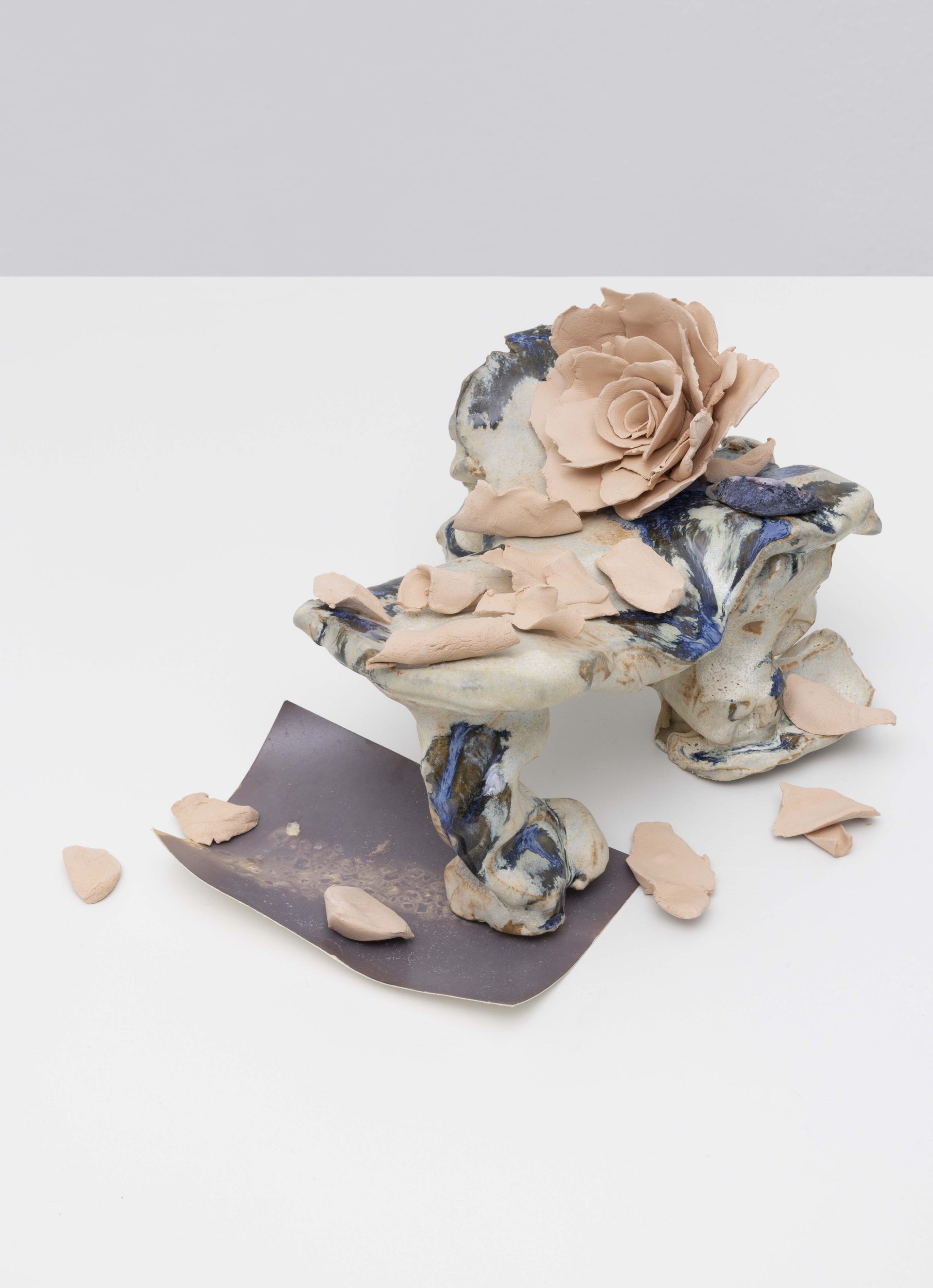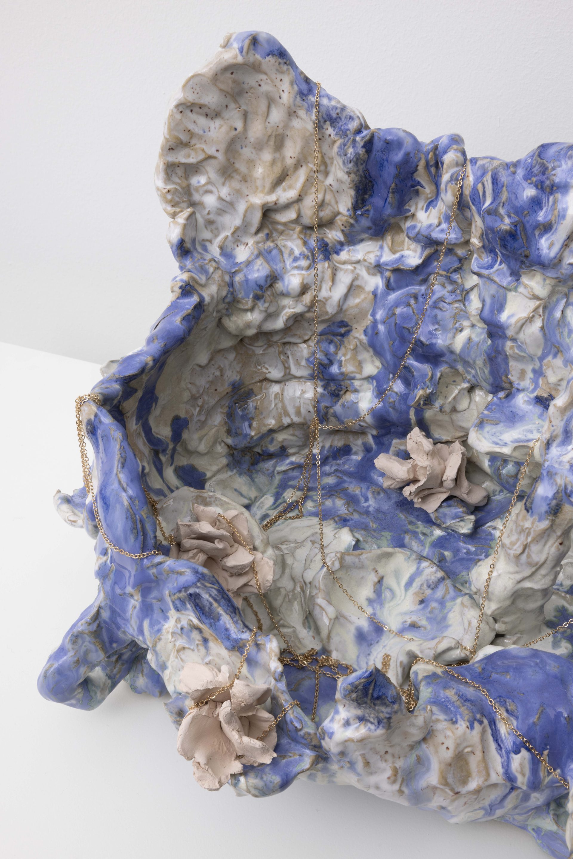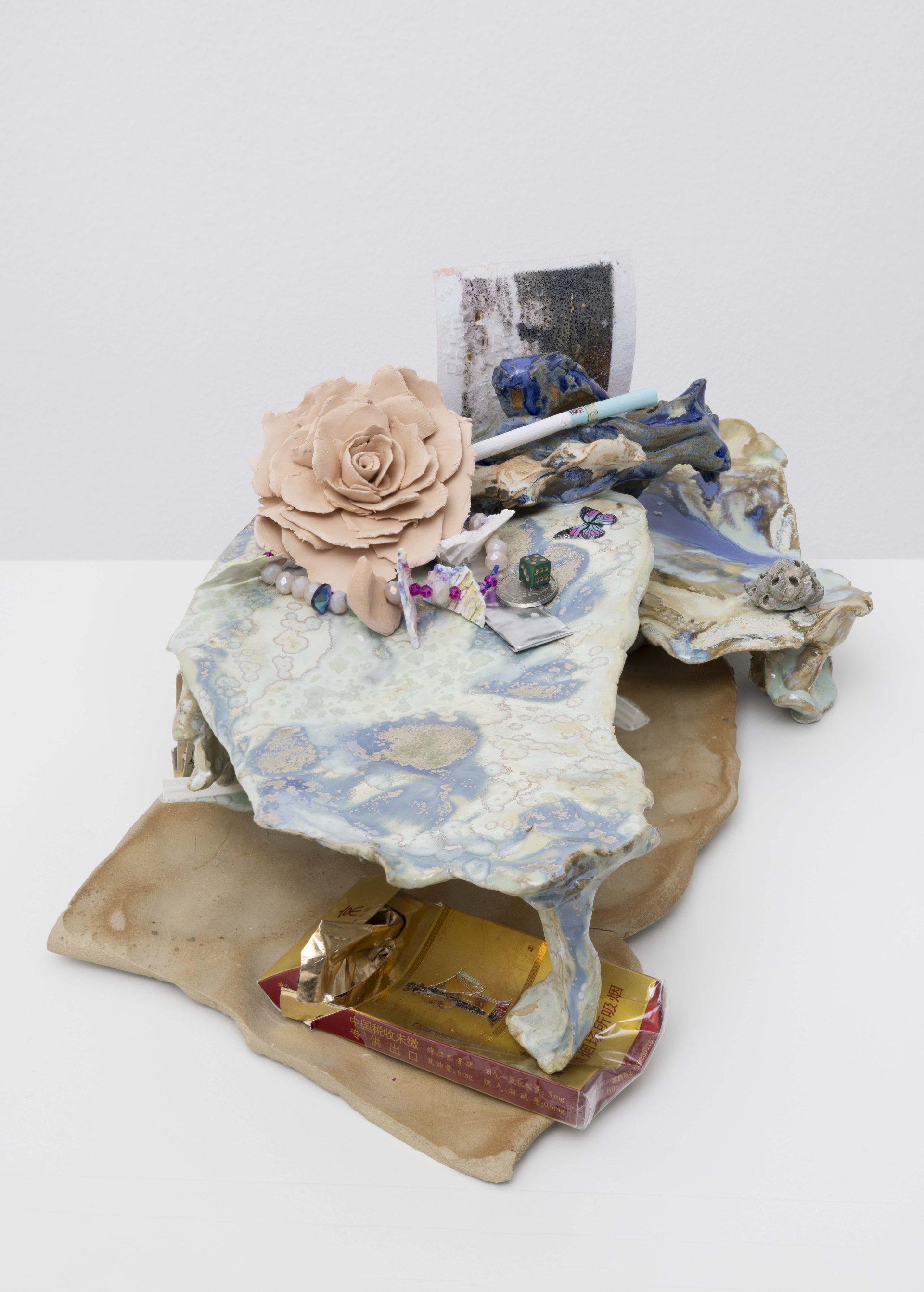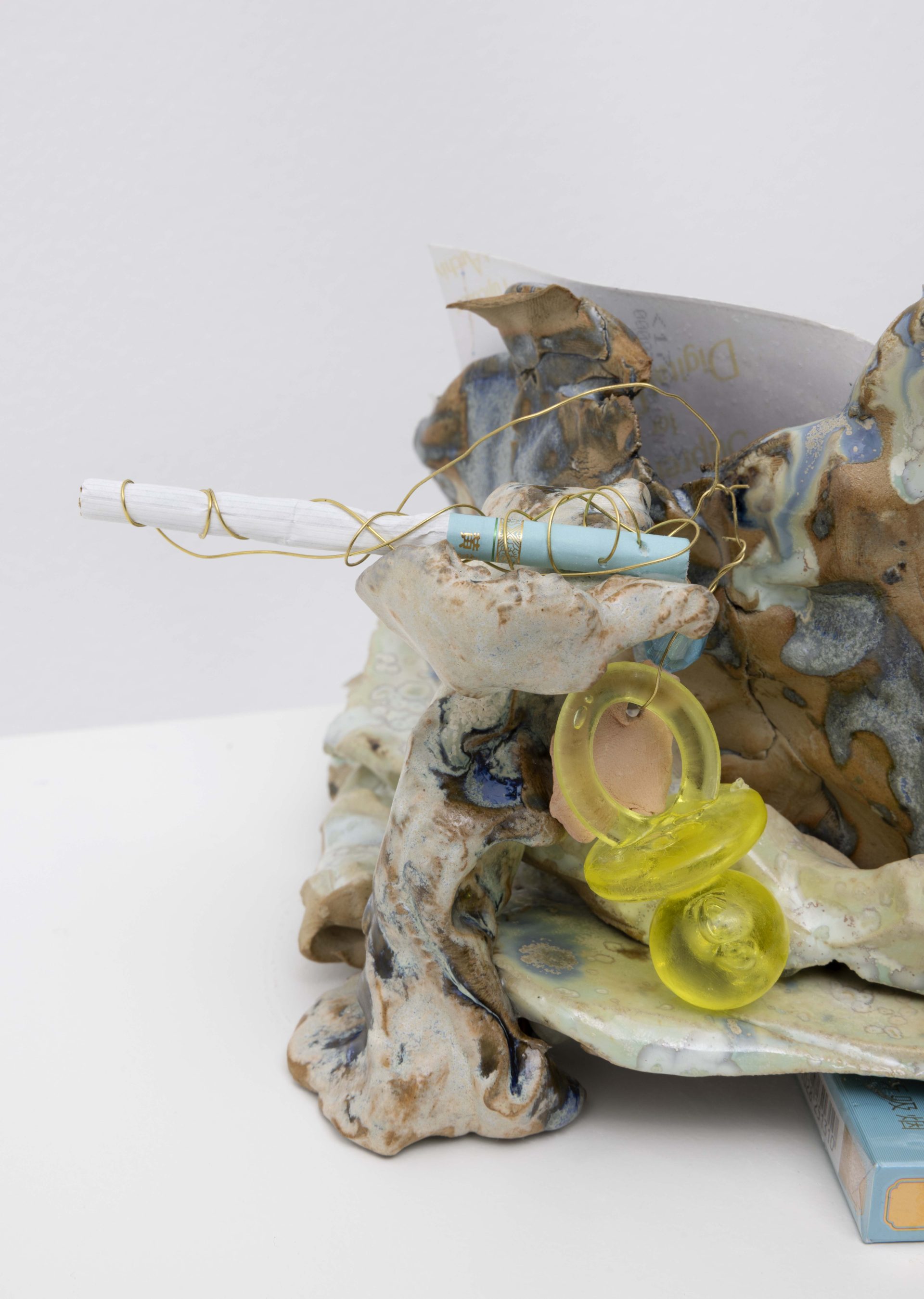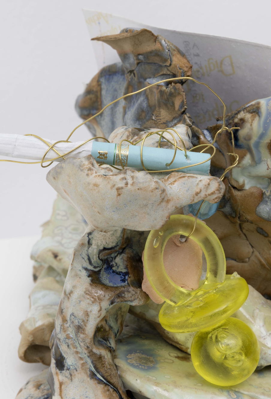 Choisne’s environments gather sculpture, image, scent, and found matter into charged constellations that oscillate between the domestic and the cosmic. At the core of Inhale in New York, a large Charm for Humanity folds lavender, coarse salt, and dried herbs into textiles, reactivating materials historically used for cleansing and protection, while a family of ceramic Boudoirs nearby offers small, contemplative zones for stillness and repair. Historically, boudoirs were spaces of gathering and exchange among women, sites of intimacy and resistance; here they serve as open sanctuaries for vulnerability, care, and reflection. Cigarettes appear occasionally like quiet provocations, a pointed note on toxicity and the illusion of release. A hand‑built brass mesh, Corps Éthérique, draws a visible yet passable line through the space, it runs through the room as a porous threshold: a filter for perspectives and energies, a line that conducts rather than divides.
