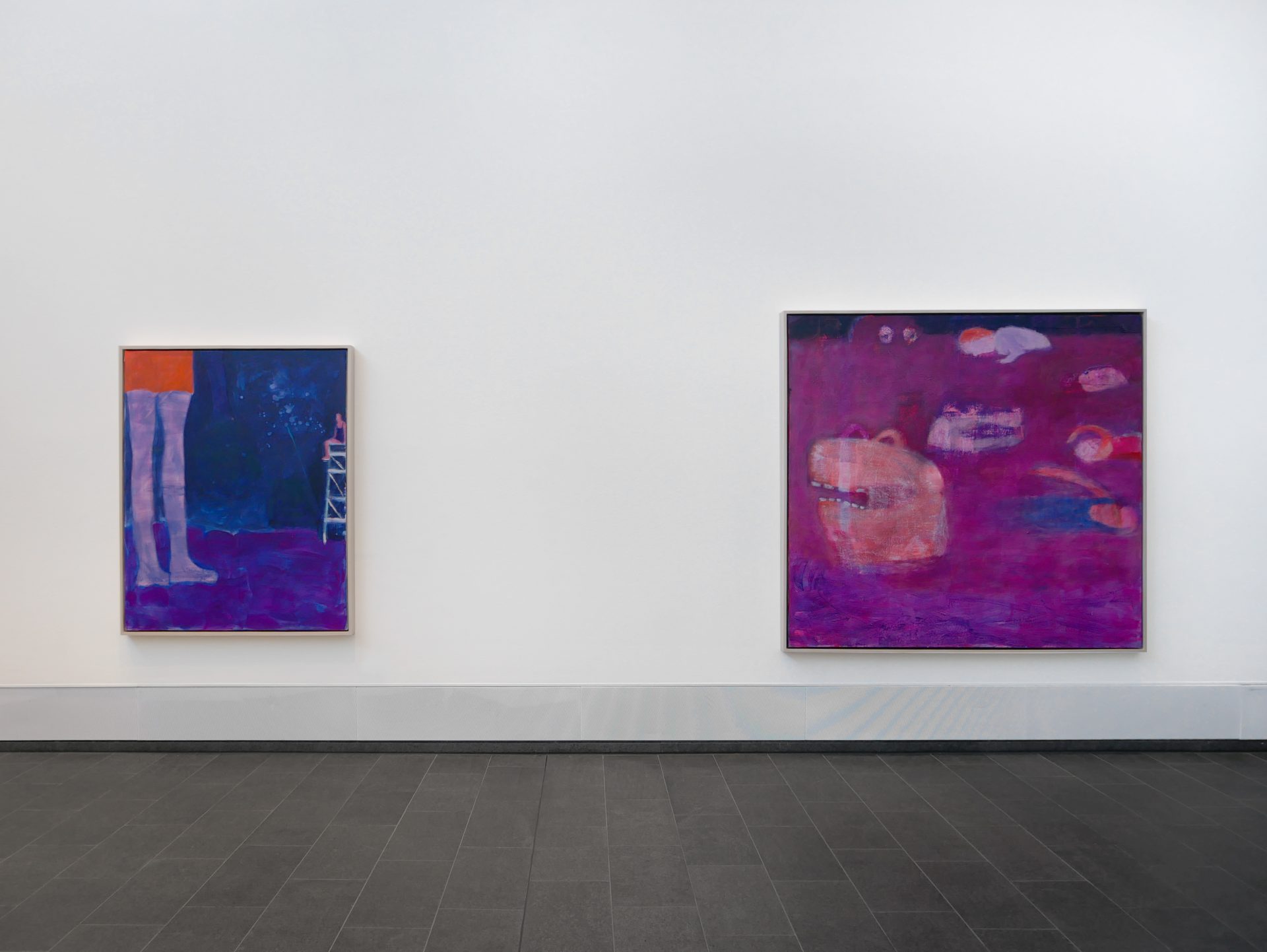 With Katherine Bradford. Sky Swimmers, Kunsthalle Emden is proud to be one of the first European institutions to present a solo exhibition of the American artist. Katherine Bradford (b. 1942) creates works that are characterized by a blend of figuration and abstraction along with a vibrant, contemporary color palette; her recurring motifs of swimmers, supermen, and acrobats populate the canvases in mystical, surreal scenes, andare the focus of the exhibition in Emden. These anonymous figures-some truncated, some whole-appear ghostly and other-worldly. Strong painterly reduction breaks them down to the essentials: devoid of faces, characteristic body features, or gender classification, the figures seem mysterious and masked. They are depicted in suspended states, in which both the before and the after are ambiguous: thus, they are made a commonplace of human existence. Whether the bodies are standing, swimming, or floating, their interrelations can be read as a visual metaphor for social relationships such as community and isolation, vulnerability and strength, and activity and passivity.