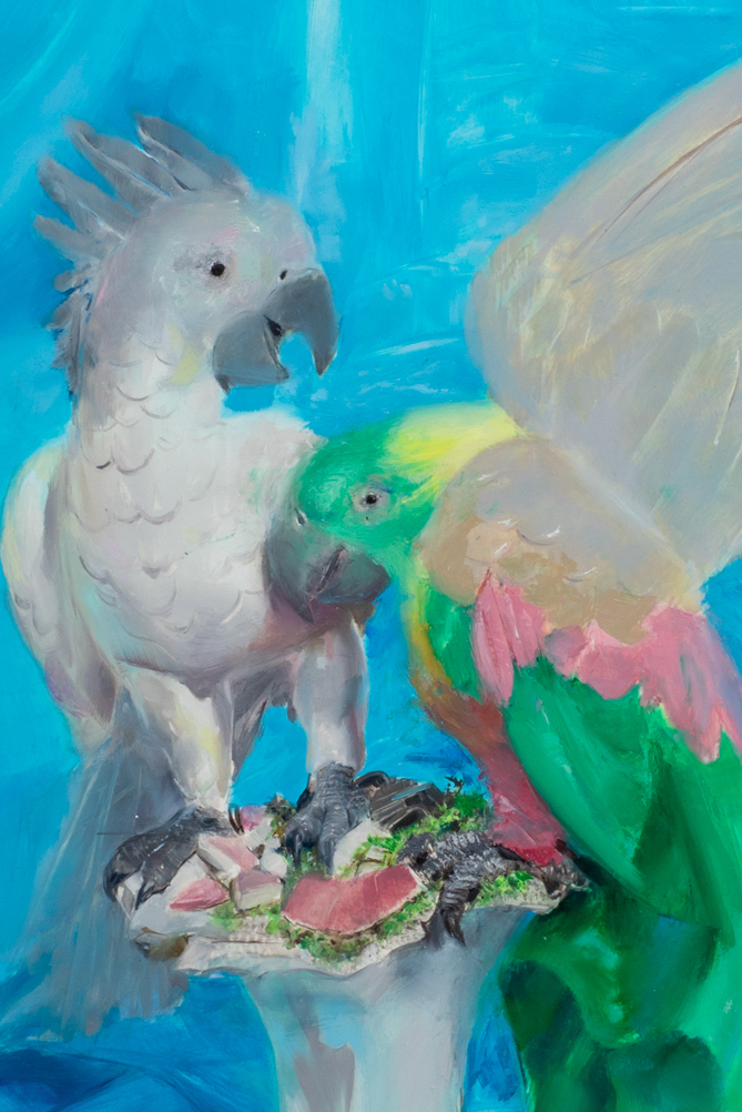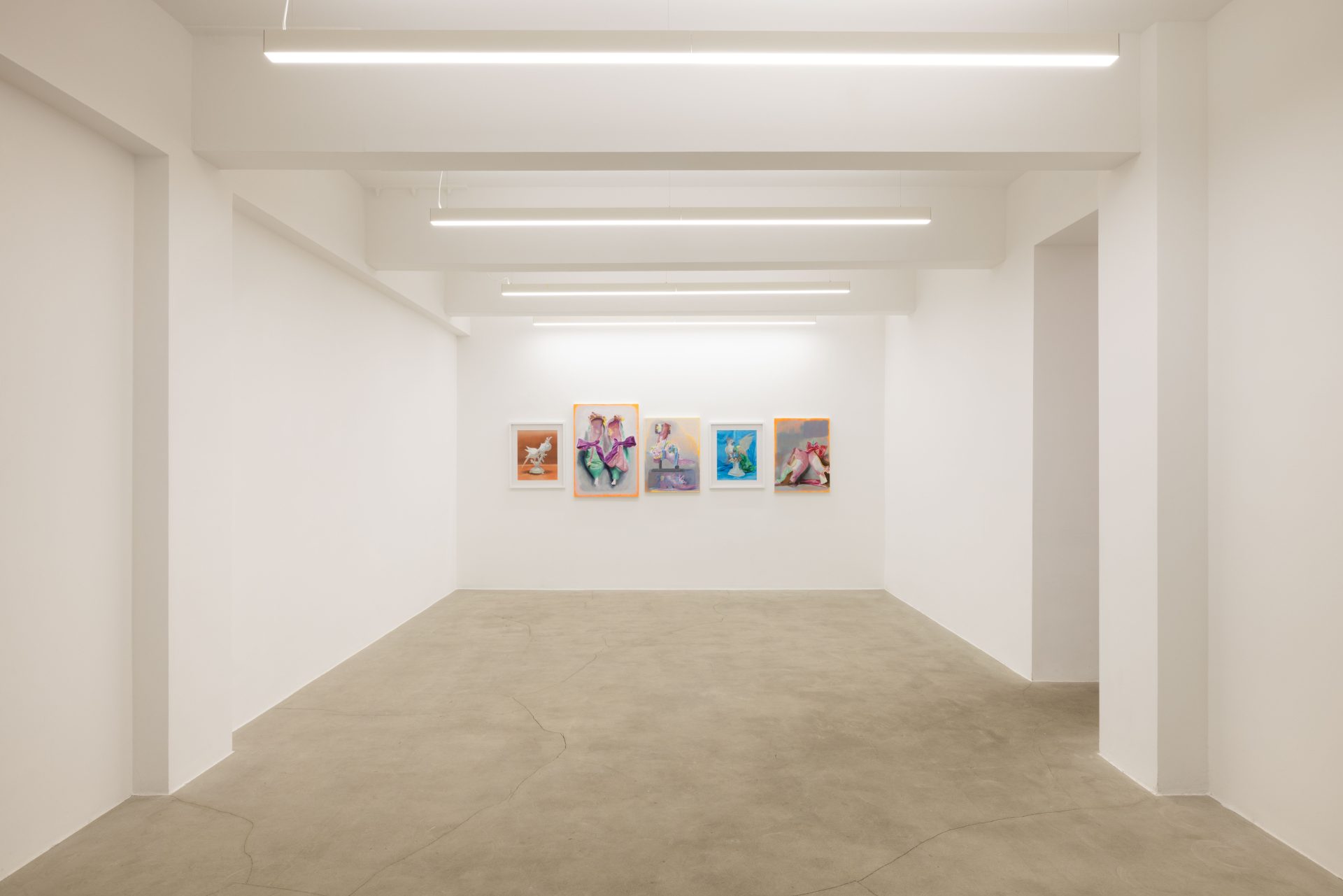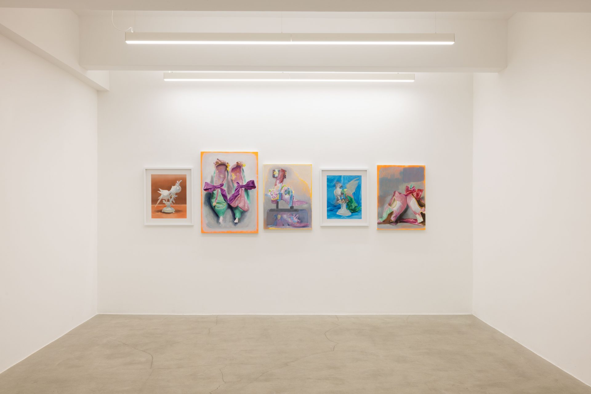 By installing all five works on a single wall, Campanini turns the area into a chamber of focus, where each image gains density through its proximity to the others. The installation reinforces the sense that these works should be read not one by one, but as a compact nucleus of variations, obsessions, and returns. Parrots and shoes belong to very different orders of experience, yet in this exhibition they begin to answer one another. One carries the charge of attachment, projection, and display; the other bears the imprint of contact, use, and bodily absence. Both become unstable presences, removed from their ordinary function and held in a space where fixity and deterioration remain closely entangled. What emerges is less a story than a concentrated emotional field, in which forms persist as if caught between memory and transformation. Within that register, painting becomes the place where images are held in suspension, neither fully resolved nor entirely released.