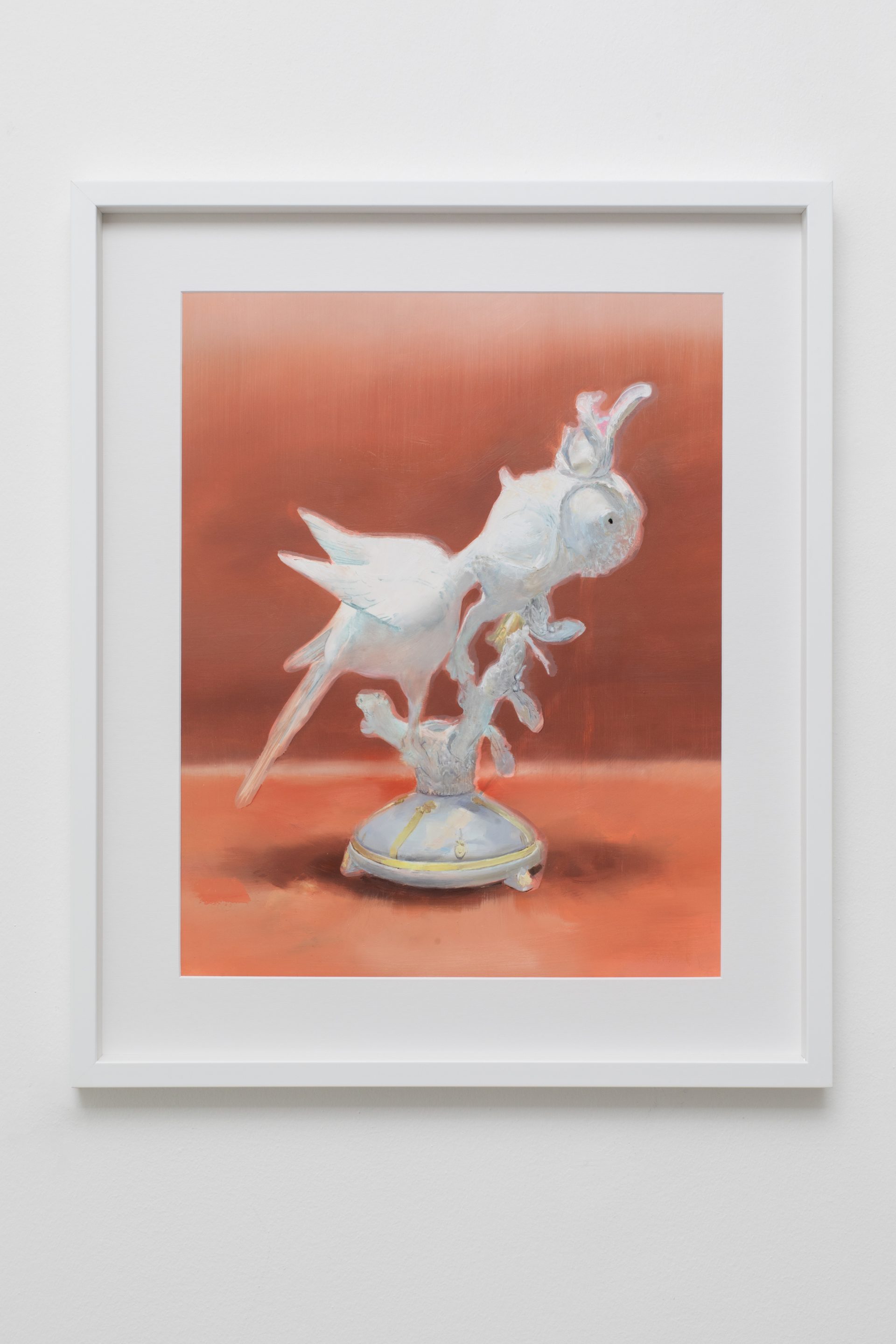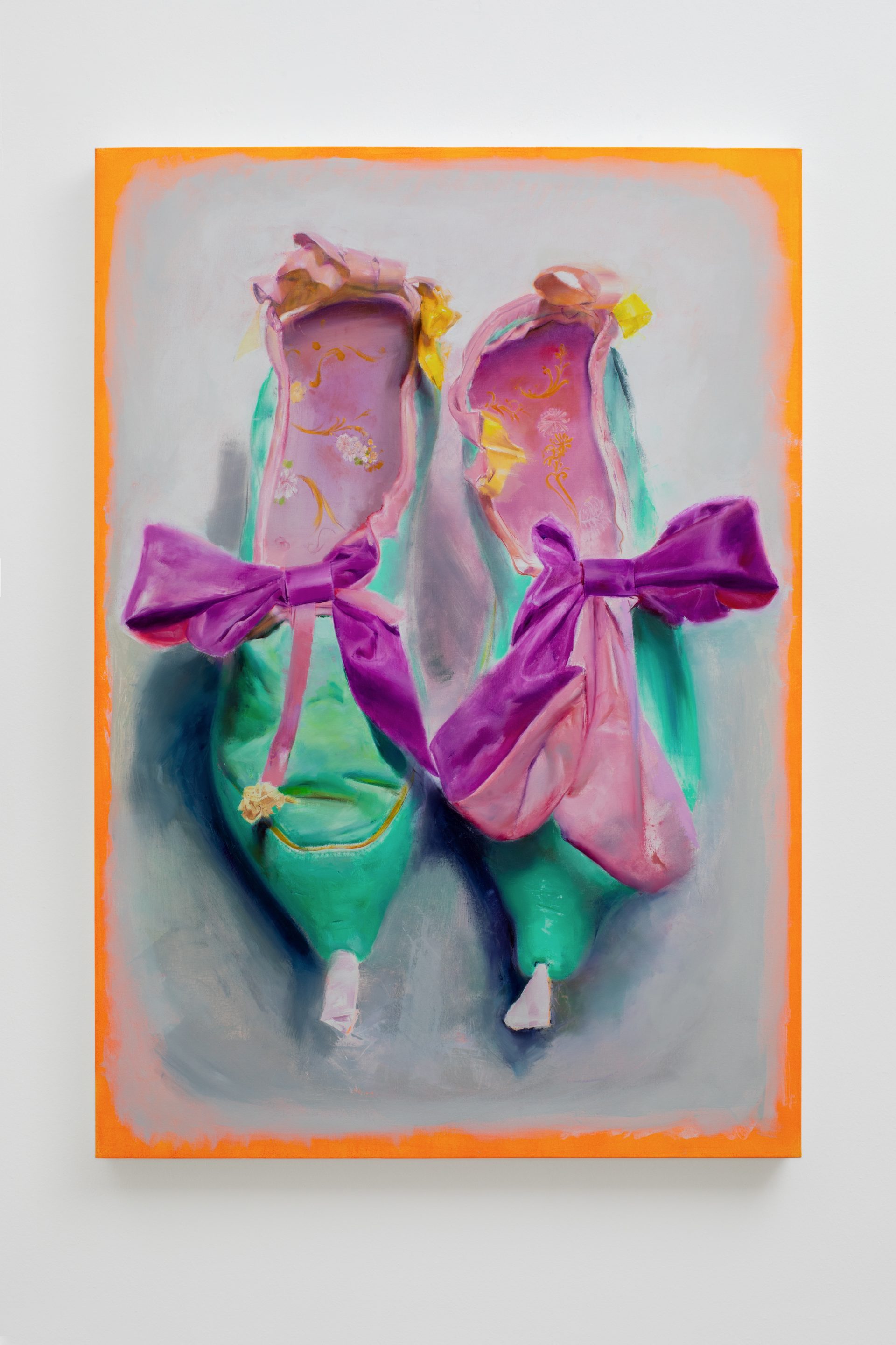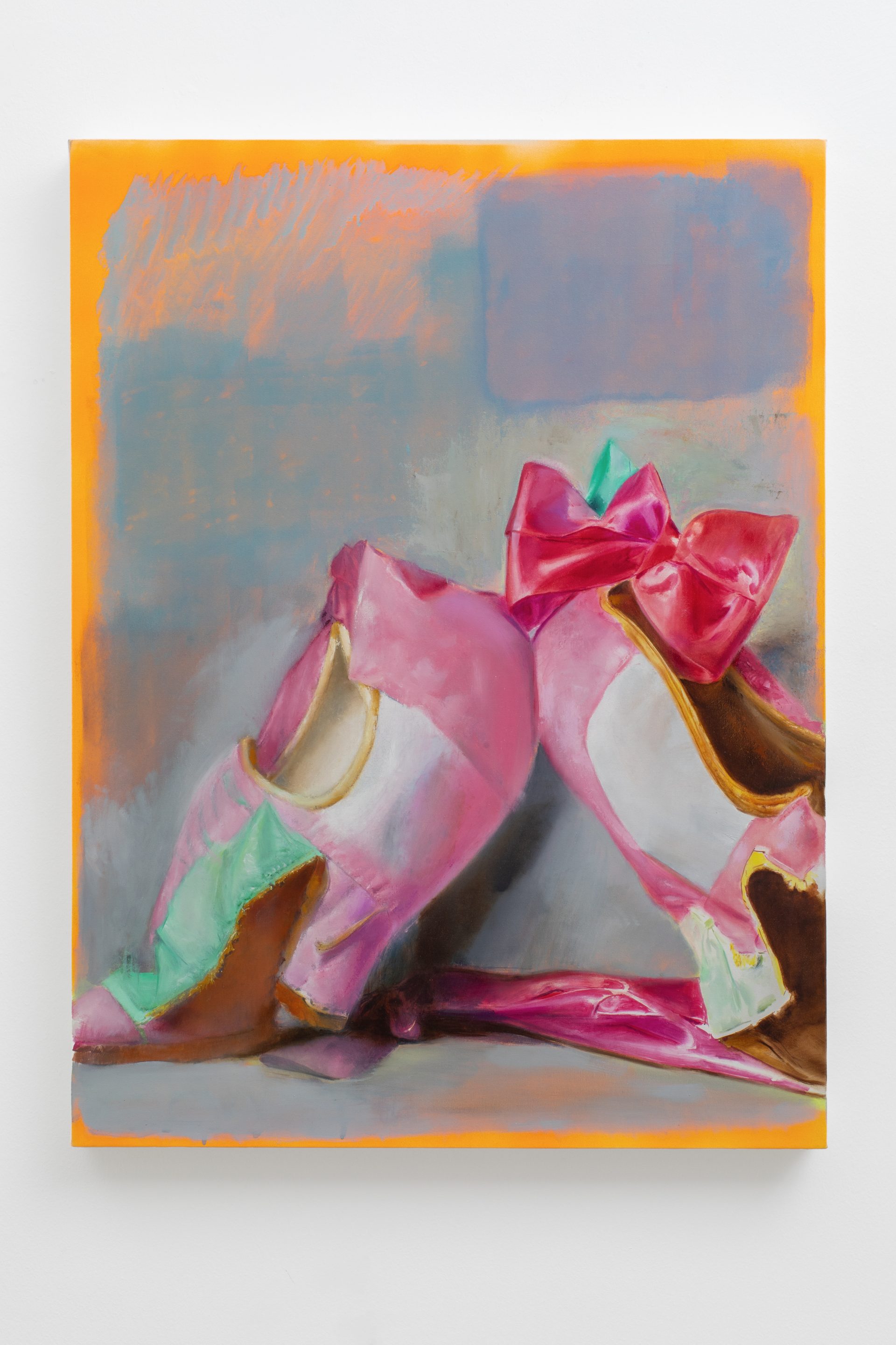 By installing all five works on a single wall, Campanini turns the area into a chamber of focus, where each image gains density through its proximity to the others. The installation reinforces the sense that these works should be read not one by one, but as a compact nucleus of variations, obsessions, and returns. Parrots and shoes belong to very different orders of experience, yet in this exhibition they begin to answer one another. One carries the charge of attachment, projection, and display; the other bears the imprint of contact, use, and bodily absence. Both become unstable presences, removed from their ordinary function and held in a space where fixity and deterioration remain closely entangled. What emerges is less a story than a concentrated emotional field, in which forms persist as if caught between memory and transformation. Within that register, painting becomes the place where images are held in suspension, neither fully resolved nor entirely released.