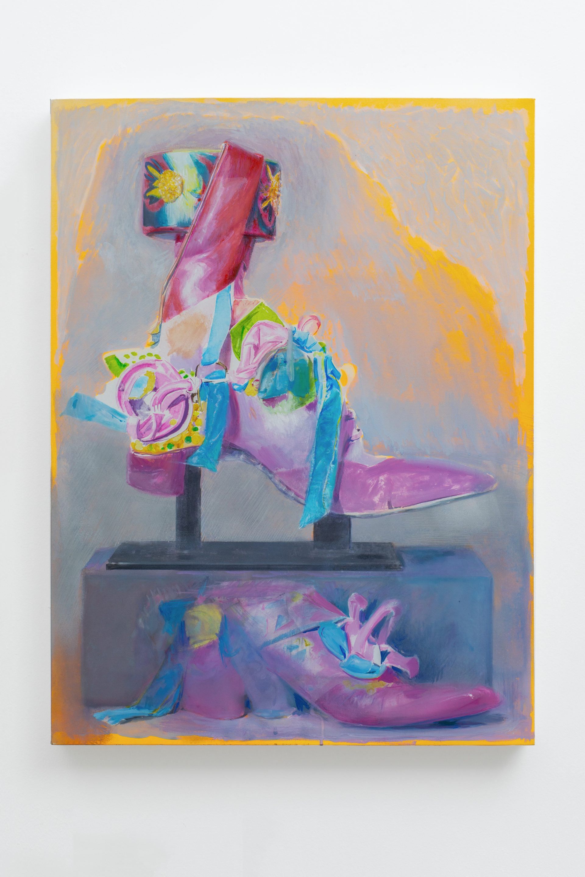 The three canvases revolve around shoes, a leitmotif throughout Campanini’s recent work. Shaped by use, pressure, and time, wrinkled, folded, and worn, they retain a tactile memory of the body while remaining detached from it. In the studio, the artist assembles them into provisional sculptural compositions, which are then broken down and reconfigured in painting. What reaches the canvas is not the object itself, but its altered afterlife: loosened from function, pushed toward ornament, puppet, shell, or fragment.