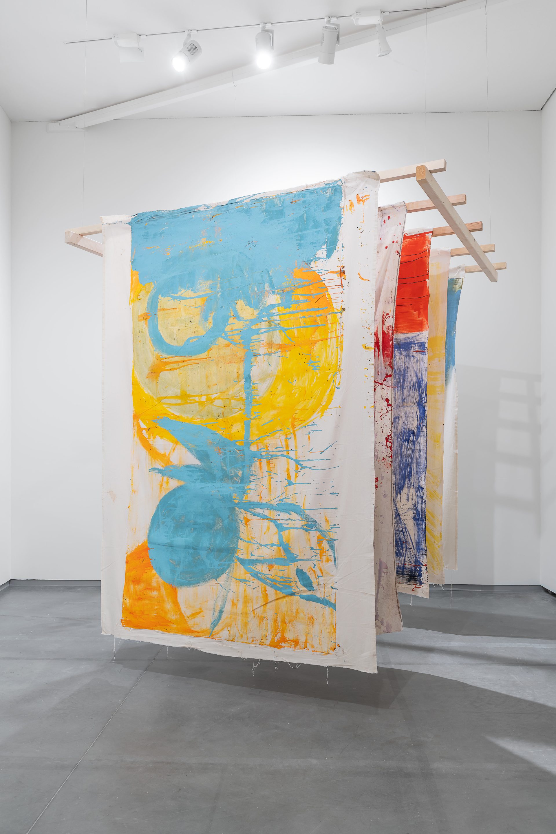 Vivian Suter’s dynamic, gestural canvases are formed through layered arrangements—stacked in rows or collaged onto walls—transforming the museum into the ground of her work. Atta Kwami’s installations and paintings feature vibrant geometric patterns, which draw upon vernacular architecture and hand-painted signage that the artist observed in Ghana. Julia Rommel emphasizes painting’s physicality by re-stretching works over differently sized frames as her work is developed, and leaving elements like staples exposed. Robert Burnier’s intimate sculptures are a scaffolding for a practice rooted in painting, suggesting that painting is as much a conceptual strategy as a material exploration.